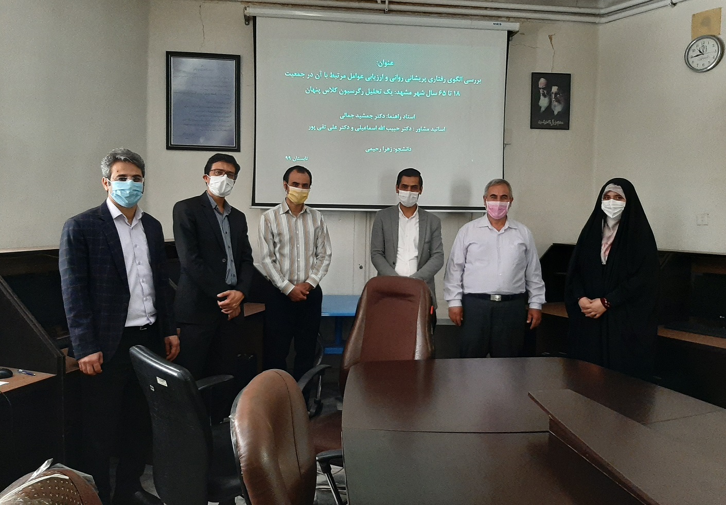 جلسه دفاع از پایاننامه ارشد خانم زهرا رحیمی در تاریخ 8 مرداد ماه ساعت 9، با موفقیت برگزار گردید. عنوان پایاننامه ایشان "بررسی الگوی رفتاری پریشانی روانی و ارزیابی عوامل مرتبط با آن در جمعیت 18 تا 65 سال شهر مشهد: یک تحلیل رگرسیون کلاس پنهان" بود. در این جلسه، خانم دکتر افضل آقایی، خانم دکتر سالاری و آقای دکتر قوامی بهعنوان داوران پایاننامه حضور داشتند. راهنمایی این پایان نامه به عهده جناب آقای دکتر جمشید جمالی و مشاوره جناب آقای دکتر علی تقی پور و جناب آقای دکتر حبیب الله اسماعیلی بود. ضمن عرض تبریک بابت ارائه خوب خانم رحیمی، برای ایشان آرزوی موفقیت و سربلندی داریم.